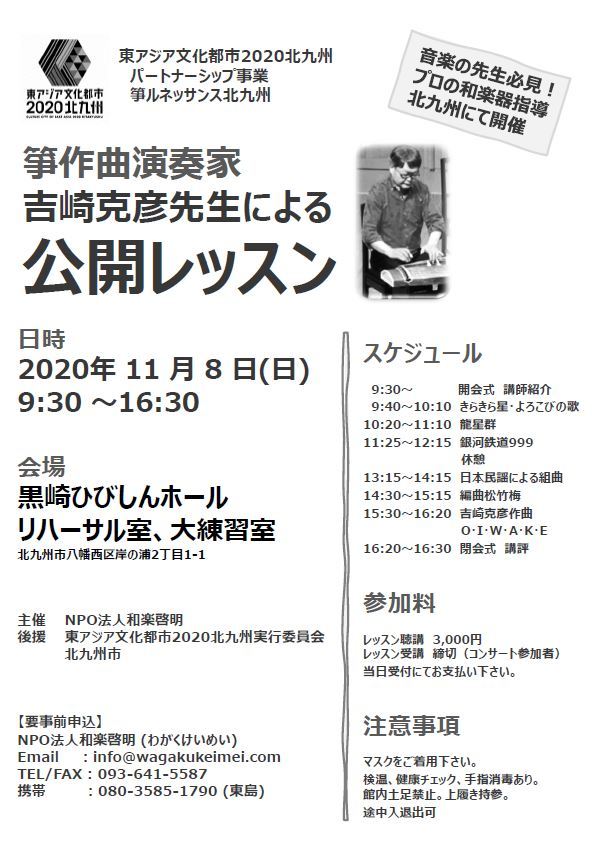 2021年4月11日に黒崎ひびしんホールで開催する「箏ルネッサンス北九州」の曲を指導していただきます。和楽器のプロの指導を北九州で見学できる機会はあまりないと思いますので、是非ご来場下さい。