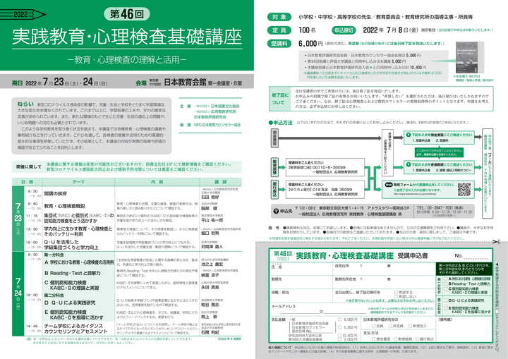 このような学校教育を取り巻く状況を踏まえ、本講座では各種教育・心理検査の講義や事例紹介などを行っていきます。これらを通して、各検査の意義や活用のための基礎的・基本的な...